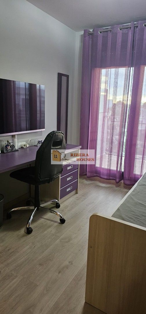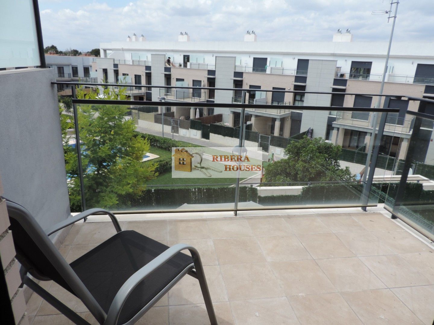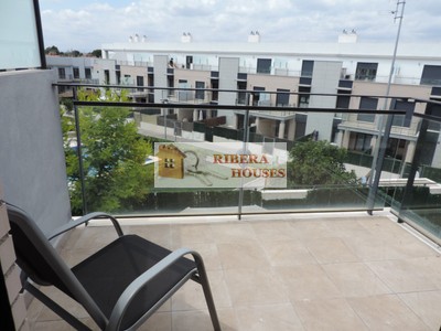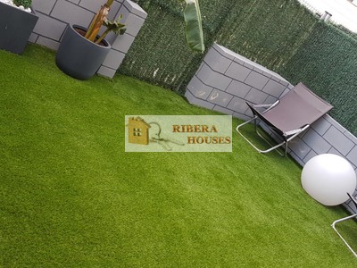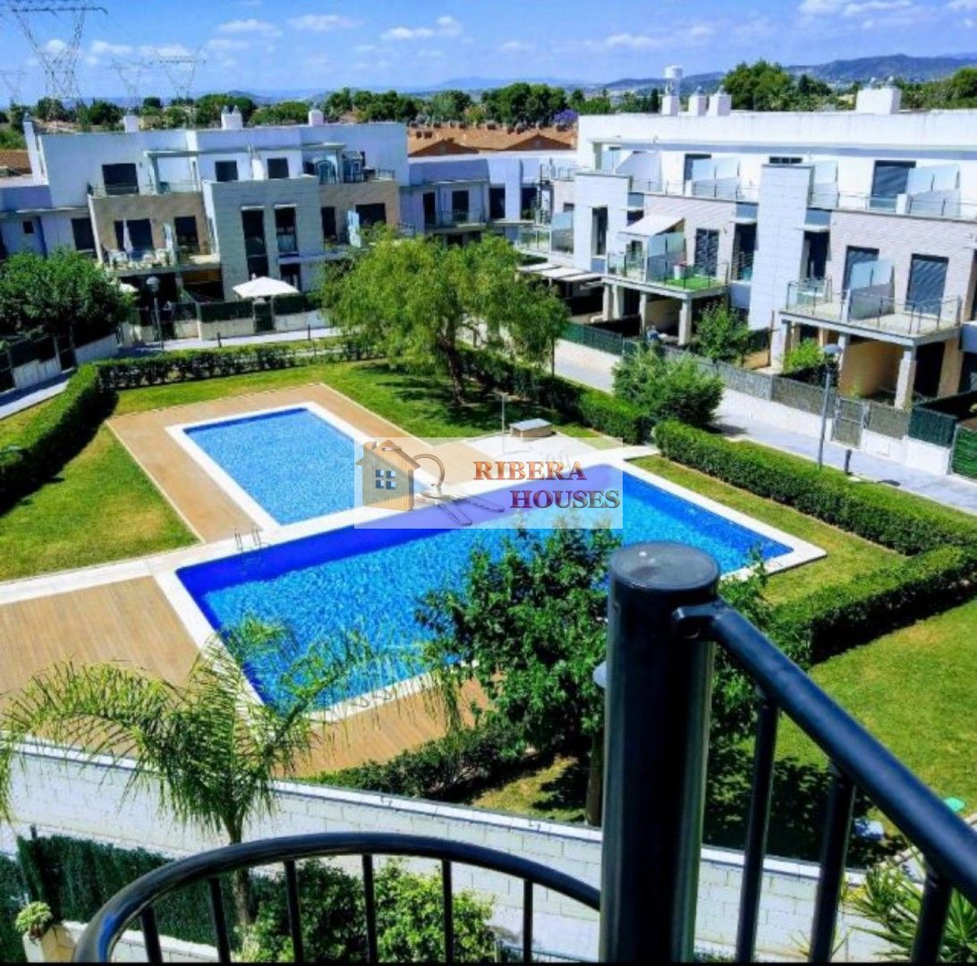 Desde el salón podemos acceder a terraza semicubierta exterior desde la cual accedemos a su vez a la zona común. La zona común tiene 2 piscinas, zona verde, parque columpios para peques. Toda la zona alumbrada por la noche.