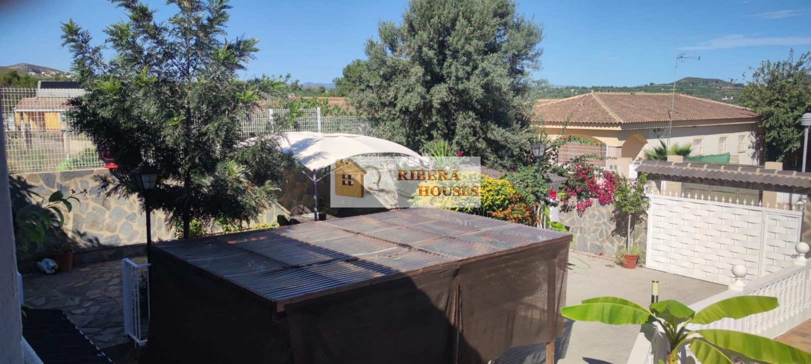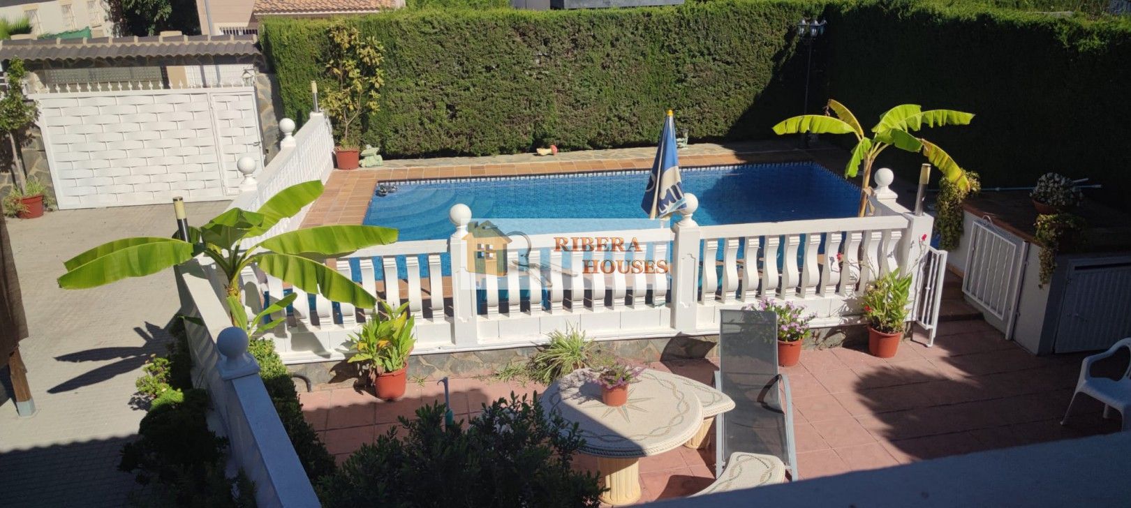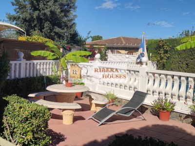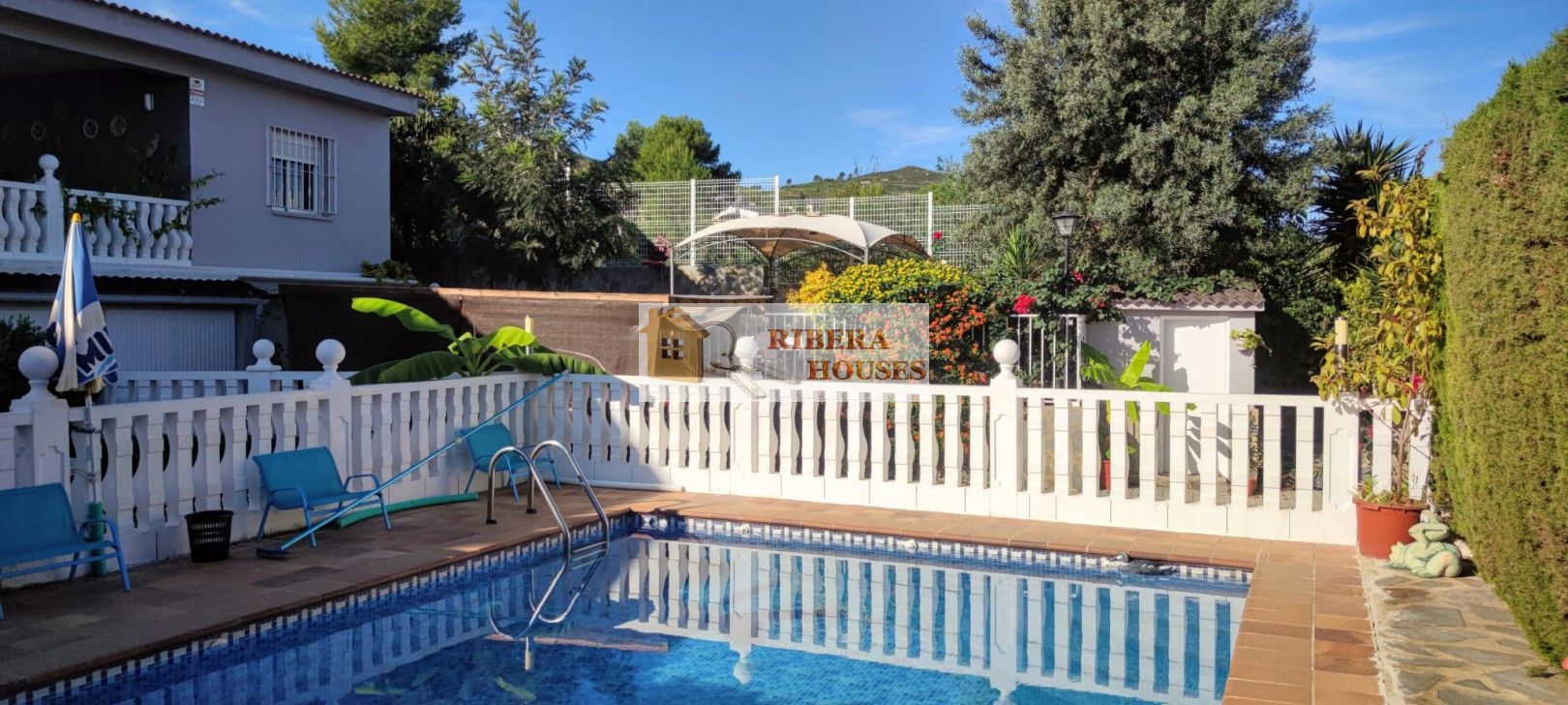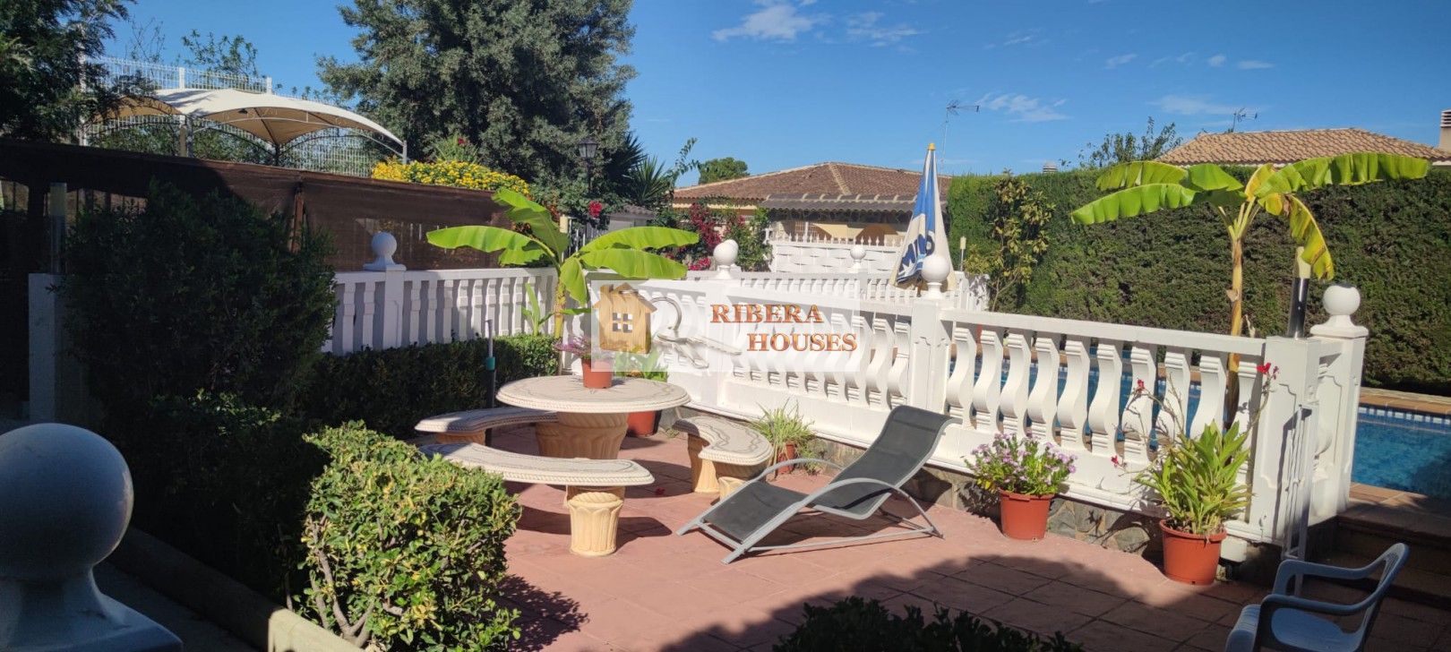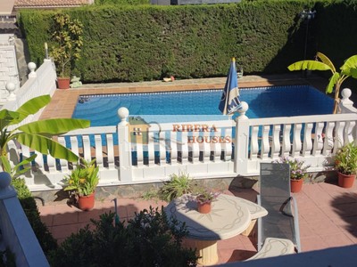 En el exterior encontramos una magnífica piscina iluminada de 50.000 litros, zona ajardinada, paellero, leñera y una pila de grandes dimensiones perfecta para limpiar paellas. Pérgola para un coche grande.
